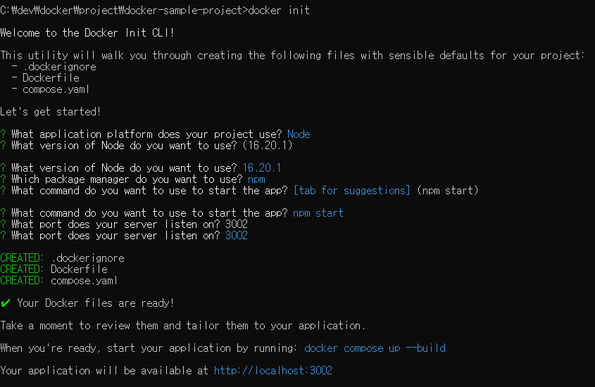 이러한 파일을 생성하는 데 도움이 되는 Docker Desktop에는 다음 docker init명령이 있습니다. 프로젝트 폴더 내의 터미널에서 이 명령을 실행하세요. docker init애플리케이션을 컨테이너화하는 데 필요한 모든 파일을 생성합니다. 이 연습에서는 이것이 어떻게 작동하는지 보여줍니다.