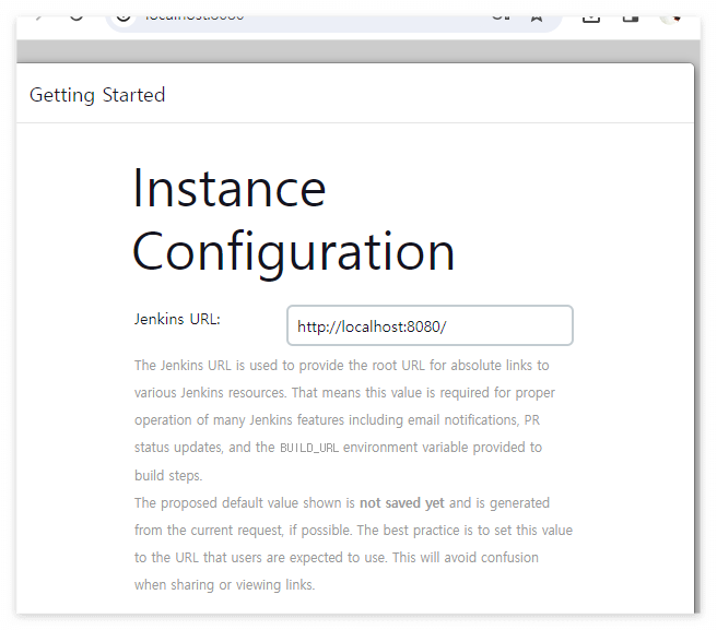 Jenkins URL은 다양한 Jenkins 리소스에 대한 절대 링크를 위한 루트 URL을 제공하는 데 사용됩니다. 즉, 이 값은 e-메일 알림, PR 상태 업데이트 및 빌드 단계에 제공되는 BUILD_URL 환경 변수를 포함한 많은 Jenkins 기능의 적절한 작동에 필요합니다.
