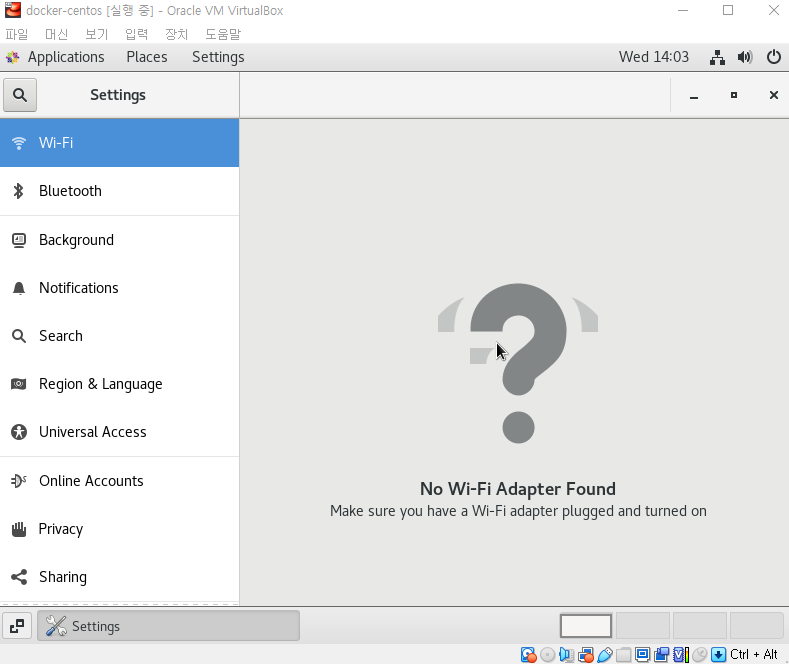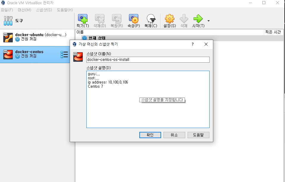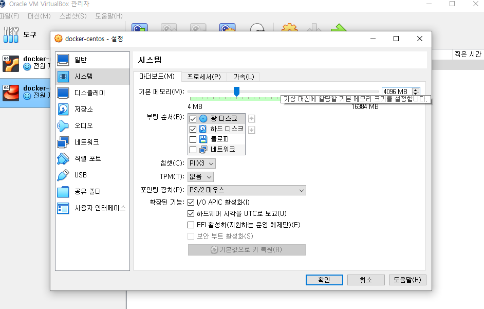 - VirtualBox > docker-centos 클릭 > 마우스 오른쪽 클릭 > 설정 클릭